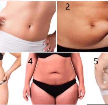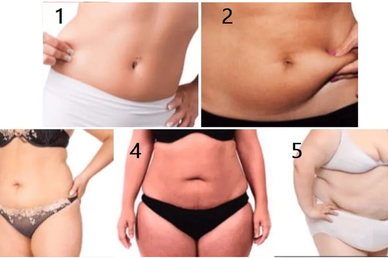 De manera simplificada, la persona en la imagen 1 sería una excelente candidata para una lipoescultura que permita definir el abdomen y lograr un aspecto más tonificado con una lipoescultura. Aunque podríamos emplear tecnologías como láser o vaser, incluso sin ellas obtendría buenos resultados. La persona en la imagen 2 se beneficiaría notablemente de una lipoescultura con la adición de tecnología de retracción cutánea, lo que ayudaría a lograr una apariencia tonificada y uniforme, sin irregularidades. A partir de la imagen 3, siempre se deberá considerar como primera opción una lipoescultura combinada con una abdominoplastia, es decir, un procedimiento que incluya un corte en la piel.